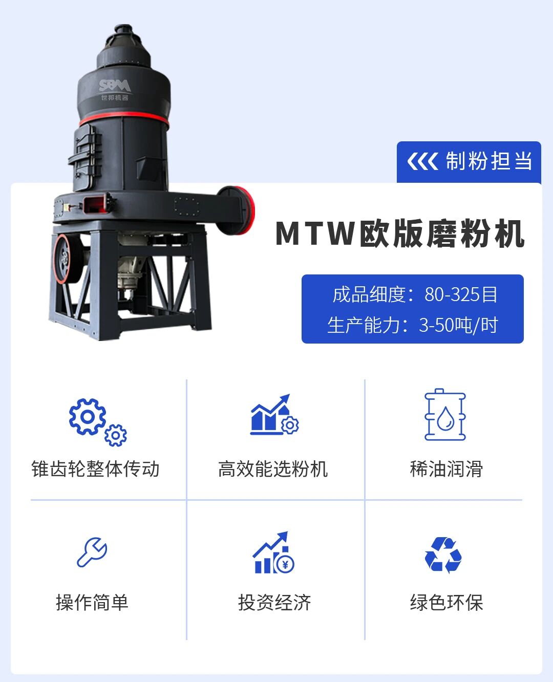 針對井陘石灰石高純度、質地均勻的物料特性,以及客戶方對碳酸鈣在細度(325目)、白度、純度、粒度分布等方面的嚴苛要求,世邦選用深耕石灰石磨粉場景多年的MTW歐版磨粉機作為核心裝備,其多項技術優(yōu)勢精準匹配高值化加工需求,為井陘石灰石打通“優(yōu)質資源→高端產品”的轉化通道。